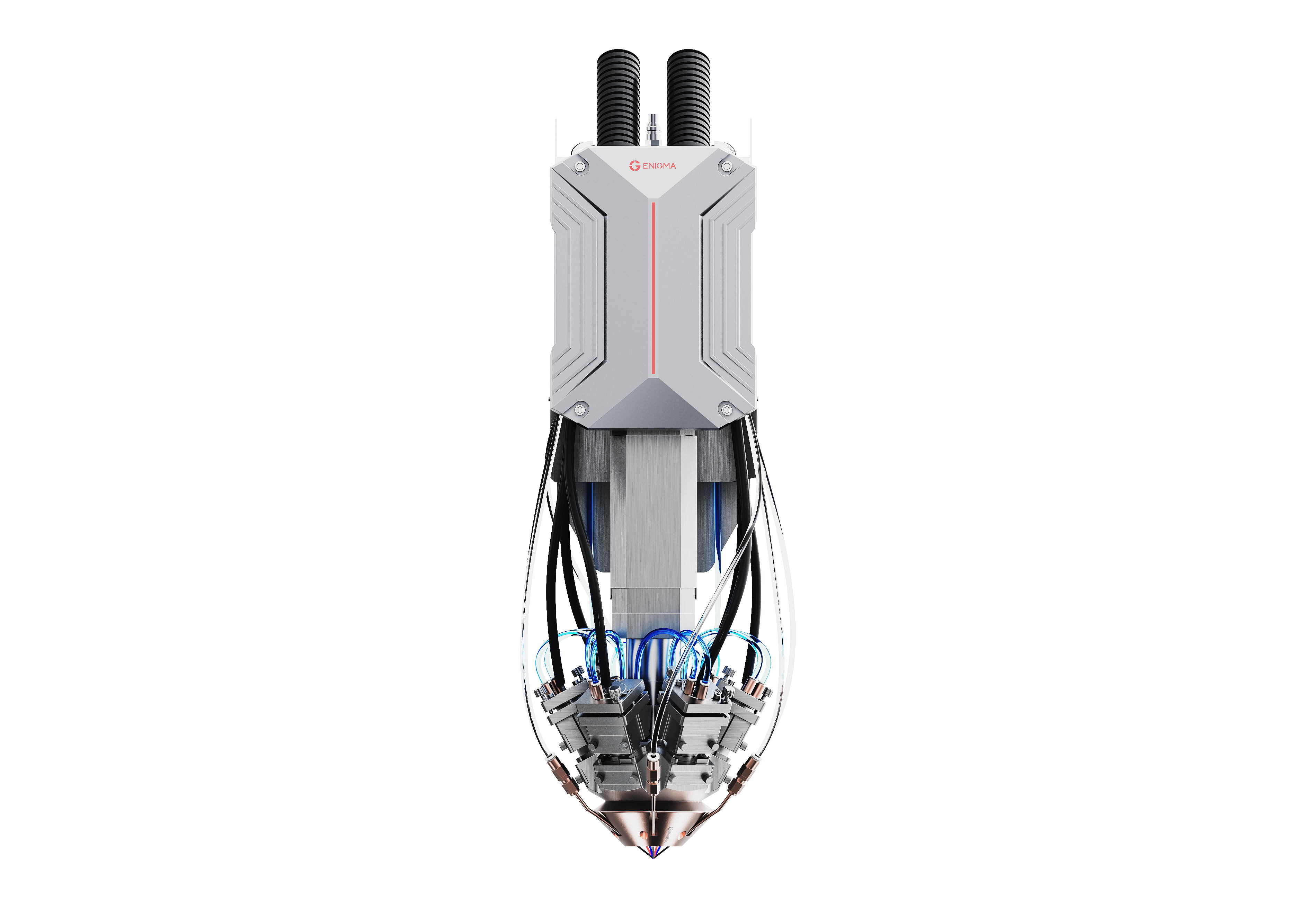 • The system combines wire feeding with six fully independent powder delivery channels to achieve independently controlled simultaneous wire-powder additive manufacturing.